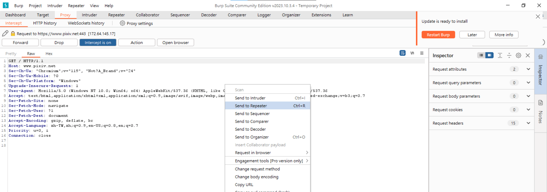 我可以把該request送到repeater這樣我就可以修改封包後重新request