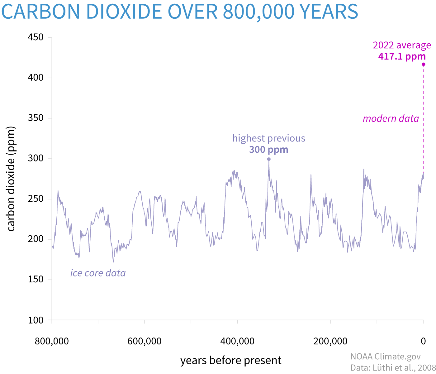 La concentration en dioxyde de carbone (CO₂) atmosphérique est plus élevée que les 3 derniers millions d'années précédents...