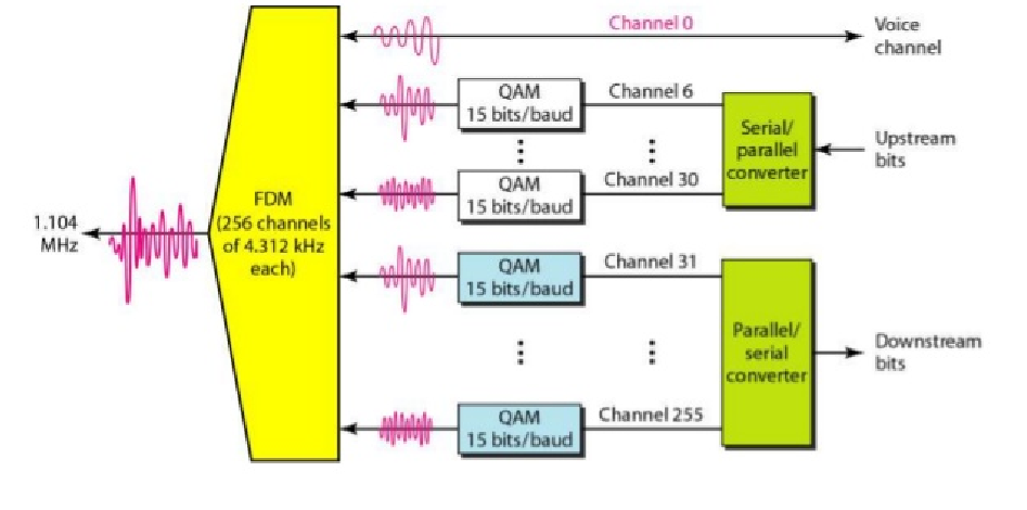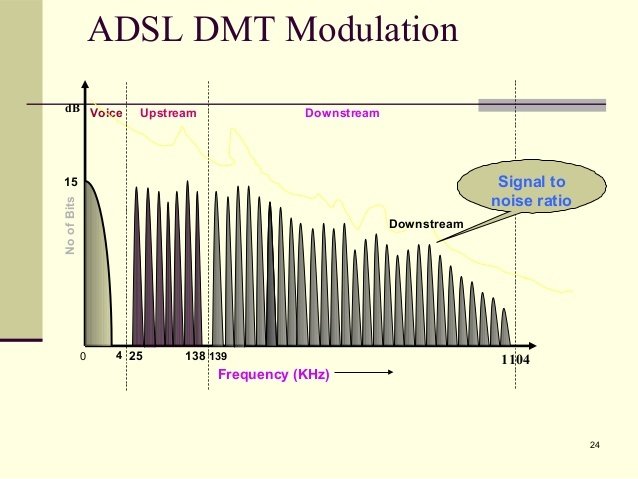 La técnica de modulación que combina QAM y FDM se ha convertido en un estándar para ADSL, y se denomina Técnica de multitono discreto (DMT)