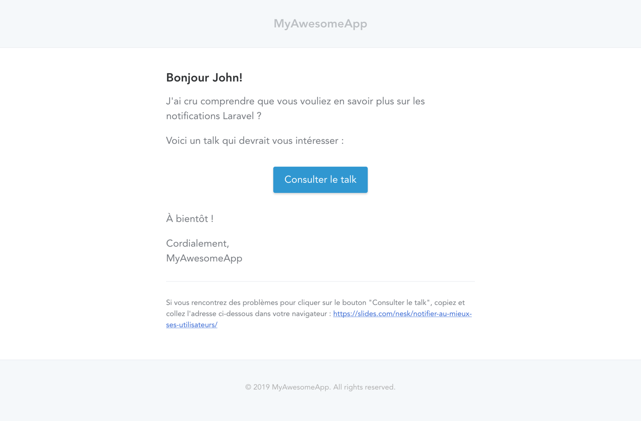 ->greeting("Bonjour {$notifiable->first_name}!")