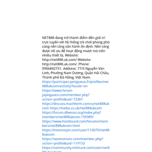 Website: http://net888.uk.com/http://net888.uk.com/ NET888 đang trở thành điểm đến giải trí trực tuyến nhờ hệ thống trò chơi đa dạng và giao diện hiện đại. Nền tảng được thiết kế với giao diện hiện đại và tốc độ truy cập ổn định. Website: http://net888.uk.com/ Địa chỉ: