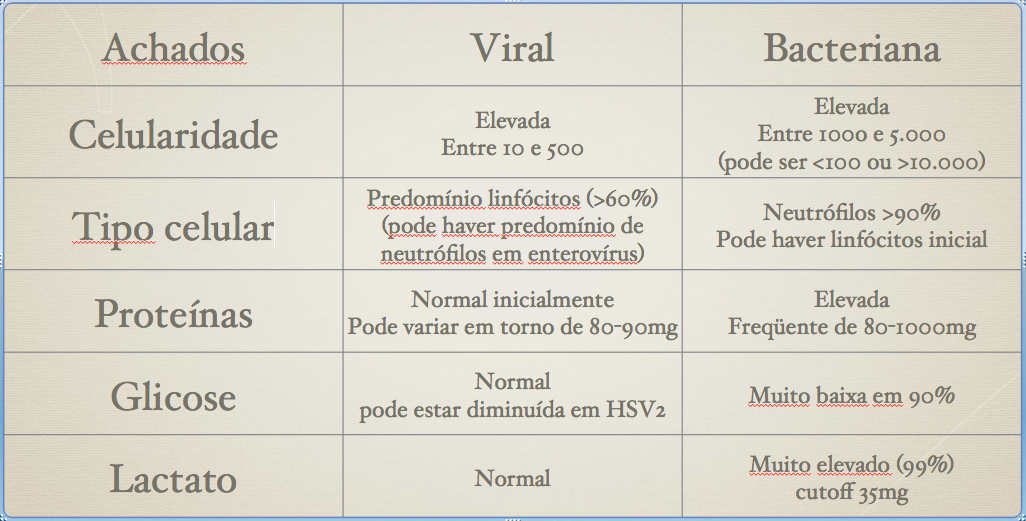 - 10% das meningites bacterianas (especialmente Listeria) podem haver >50% de linfócitos ou monócitos)