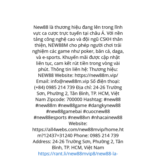 Website: https://all4webs.com/new88mvip/home.htm?12437=31240 New88 là thương hiệu đang lên trong lĩnh vực ca cược trực tuyến tại châu Á. Với nền tảng công nghệ cao và đội ngũ CSKH thân thiện, NEW88M cho phép người chơi trải nghiệm các game như poker,