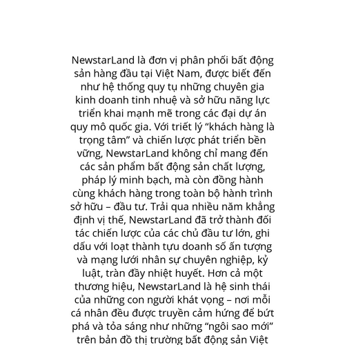 Website: https://newstarland.com. NewstarLand là đơn vị phân phối bất động sản hàng đầu tại Việt Nam, được biết đến như hệ thống quy tụ những chuyên gia kinh doanh tinh nhuệ và sở hữu năng lực triển khai mạnh mẽ trong các đại dự án quy mô quốc gia. V
