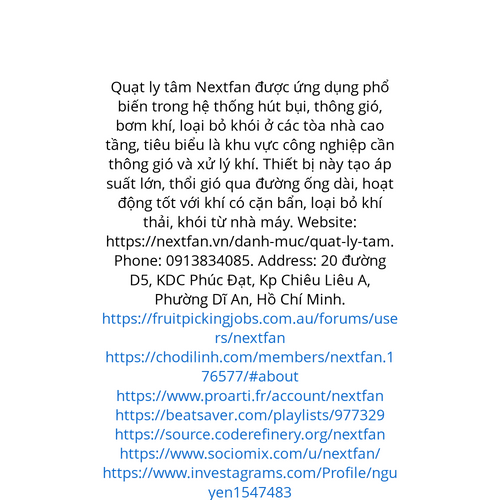 Website: https://nextfan.vn/danh-muc/quat-ly-tam. Quạt ly tâm Nextfan được ứng dụng phổ biến trong hệ thống hút bụi, thông gió, bơm khí, loại bỏ khói ở các tòa nhà cao tầng, tiêu biểu là khu vực công nghiệp cần thông gió và xử lý khí. Thiết bị này tạ