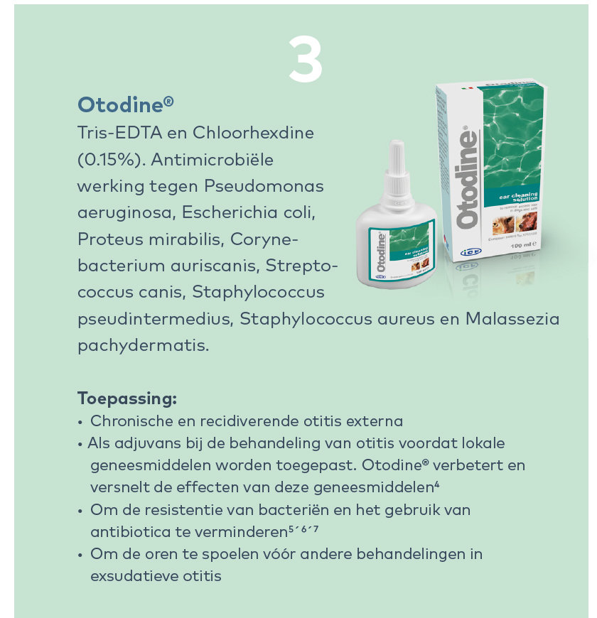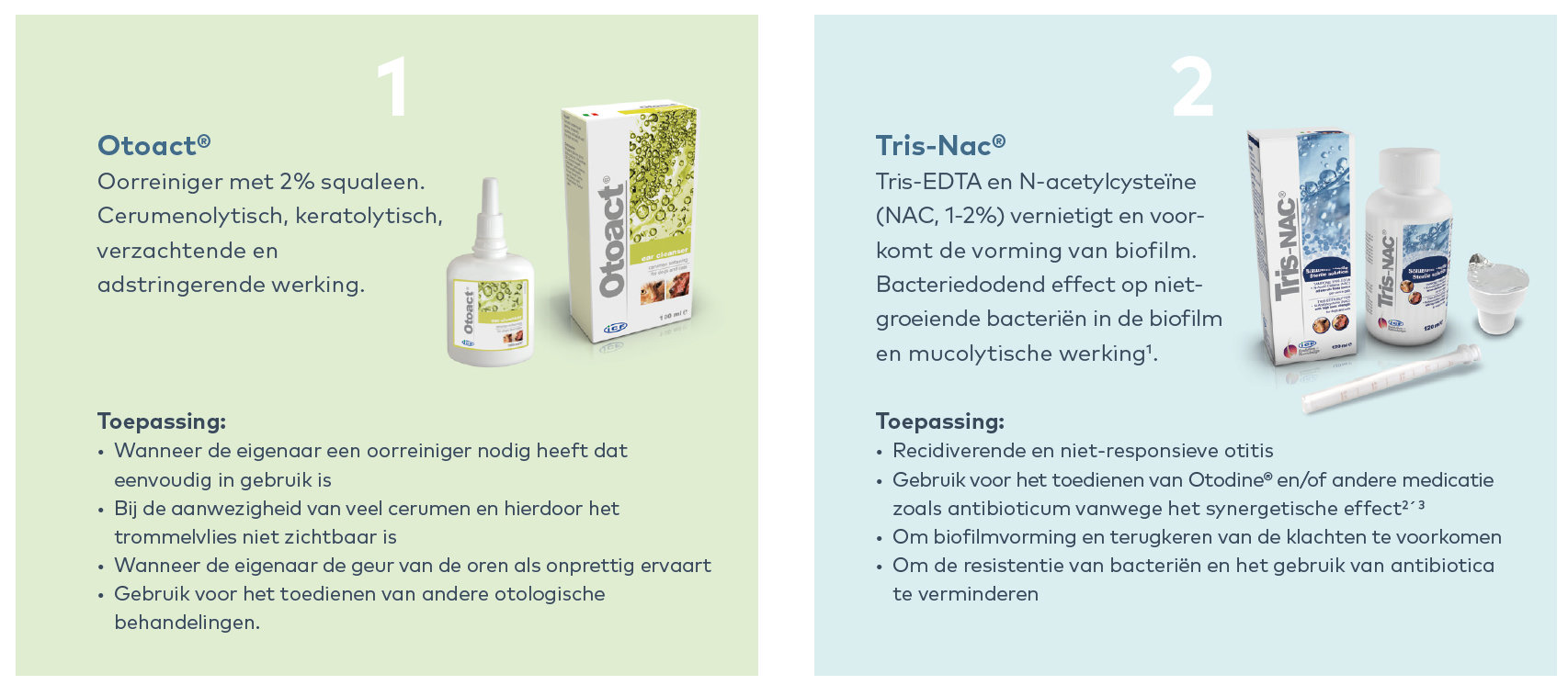 De voornaamste reden voor een huisdiereigenaar om te wisselen van dierenarts is een verkeerd behandelde otitis. Onderstaande producten zijn effectief in de behandeling van chronische of recidiverende otitis en verminderen het gebruik van antibioticum.