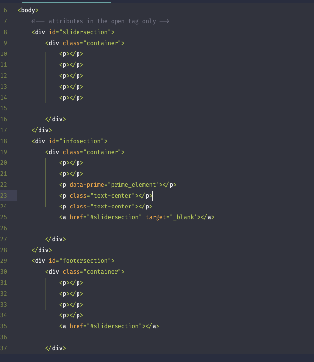 We create the <body> element by using the opening and closing <body> tags. Web browsers will render any content inside the <body> tags. The <body> element should contain all content meant to be rendered to a web page. There can be one <body> element per HTML document.