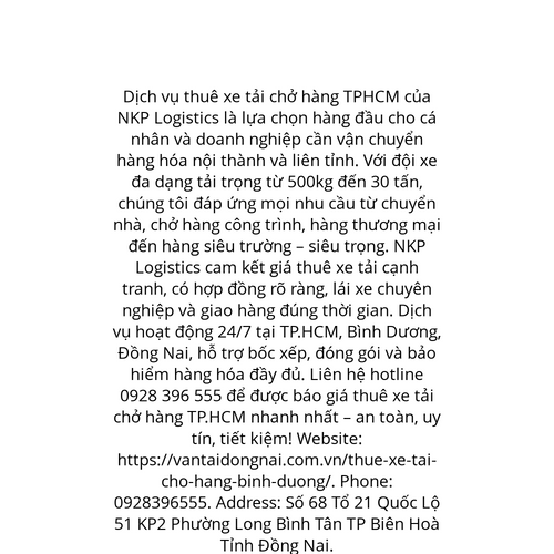 Website: https://vantaidongnai.com.vn/thue-xe-tai-cho-hang-binh-duong/. Dịch vụ thuê xe tải chở hàng TPHCM của NKP Logistics là lựa chọn hàng đầu cho cá nhân và doanh nghiệp cần vận chuyển hàng hóa nội thành và liên tỉnh. Với đội xe đa dạng tải trọng