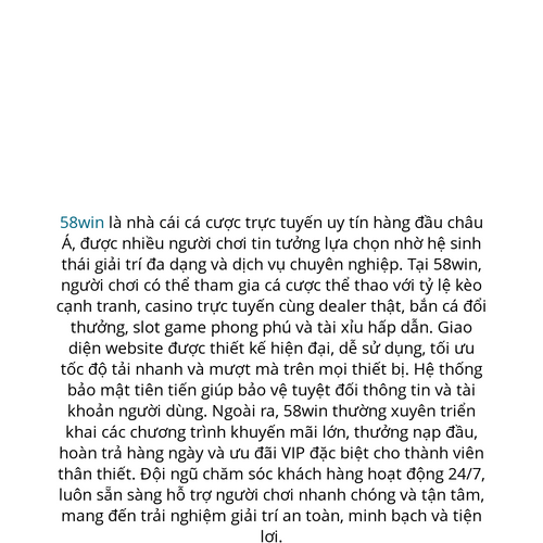 58win là nhà cái cá cược trực tuyến hàng đầu, cung cấp đa dạng trò chơi như thể thao, casino, bắn cá, slot game và tài xỉu. Giao diện hiện đại, bảo mật cao, khuyến mãi hấp dẫn. Website: https://58win1.london