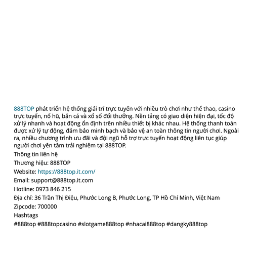 888TOP phát triển hệ thống giải trí trực tuyến với nhiều trò chơi như thể thao, casino trực tuyến, nổ hũ, bắn cá và xổ số đổi thưởng. Website: https://888top.it.com/