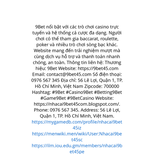 Website: https://nhacai9bet45com.blogspot.com/. 9Bet nổi bật với các trò chơi casino trực tuyến và hệ thống cá cược đa dạng. Người chơi có thể tham gia baccarat, roulette, poker và nhiều trò chơi sòng bạc khác. Website mang đến trải nghiệm mượt mà cù
