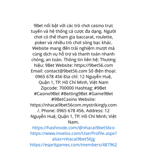 Website: https://nhacai9bet56com.mystrikingly.com/. 9Bet nổi bật với các trò chơi casino trực tuyến và hệ thống cá cược đa dạng. Người chơi có thể tham gia baccarat, roulette, poker và nhiều trò chơi sòng bạc khác. Website mang đến trải nghiệm mượt m
