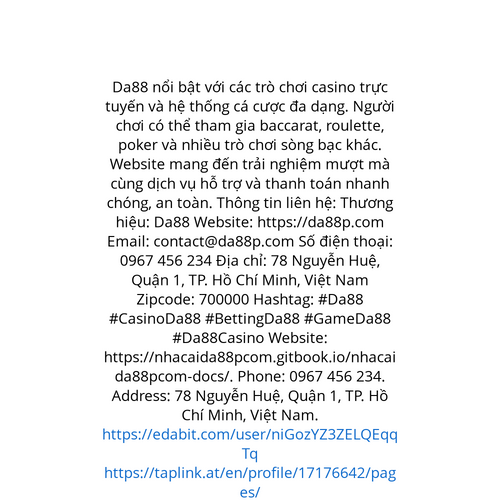 Website: https://nhacaida88pcom.gitbook.io/nhacaida88pcom-docs/. Da88 nổi bật với các trò chơi casino trực tuyến và hệ thống cá cược đa dạng. Người chơi có thể tham gia baccarat, roulette, poker và nhiều trò chơi sòng bạc khác. Website mang đến trải