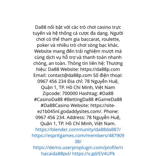 Website: https://site-ez1b045nl.godaddysites.com/. Da88 nổi bật với các trò chơi casino trực tuyến và hệ thống cá cược đa dạng. Người chơi có thể tham gia baccarat, roulette, poker và nhiều trò chơi sòng bạc khác. Website mang đến trải nghiệm mượt mà