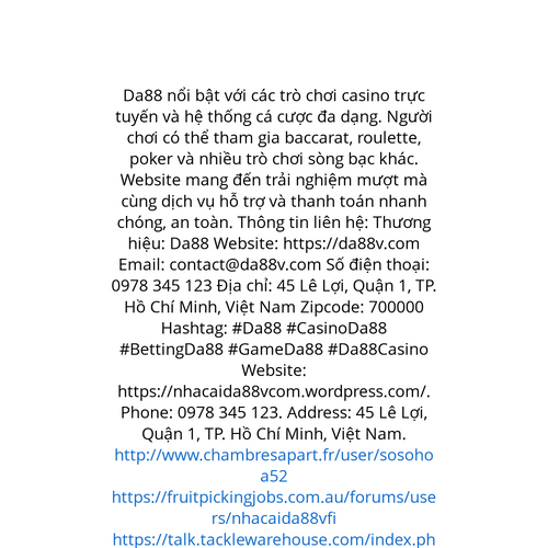 Website: https://nhacaida88vcom.wordpress.com/. Da88 nổi bật với các trò chơi casino trực tuyến và hệ thống cá cược đa dạng. Người chơi có thể tham gia baccarat, roulette, poker và nhiều trò chơi sòng bạc khác. Website mang đến trải nghiệm mượt mà cù
