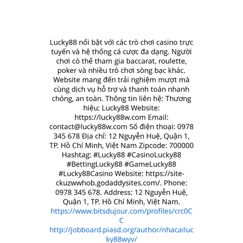 Website: https://site-ckuzwwhob.godaddysites.com/. Lucky88 nổi bật với các trò chơi casino trực tuyến và hệ thống cá cược đa dạng. Người chơi có thể tham gia baccarat, roulette, poker và nhiều trò chơi sòng bạc khác. Website mang đến trải nghiệm mượt