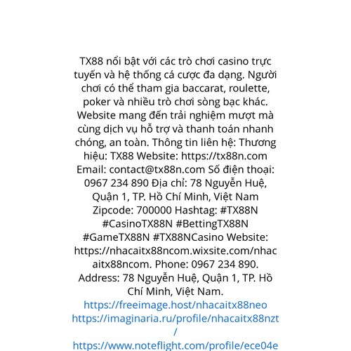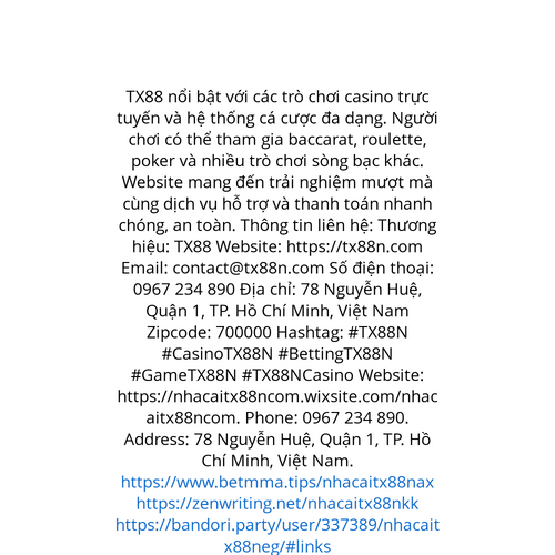 Website: https://nhacaitx88ncom.wixsite.com/nhacaitx88ncom. TX88 nổi bật với các trò chơi casino trực tuyến và hệ thống cá cược đa dạng. Người chơi có thể tham gia baccarat, roulette, poker và nhiều trò chơi sòng bạc khác. Website mang đến trải nghiệ