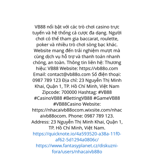 Website: https://nhacaivb88ocom.wixsite.com/nhacaivb88ocom. VB88 nổi bật với các trò chơi casino trực tuyến và hệ thống cá cược đa dạng. Người chơi có thể tham gia baccarat, roulette, poker và nhiều trò chơi sòng bạc khác. Website mang đến trải nghiệ