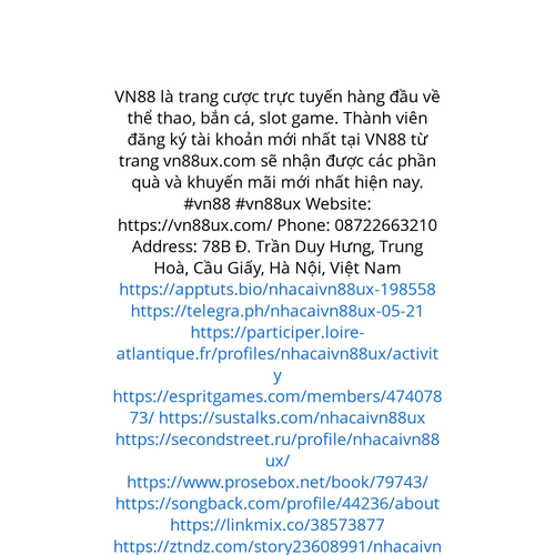 Website: https://vn88ux.com/ VN88 là trang cược trực tuyến hàng đầu về thể thao, bắn cá, slot game. Thành viên đăng ký tài khoản mới nhất tại VN88 từ trang vn88ux.com sẽ nhận được các phần quà và khuyến mãi mới nhất hiện nay. #vn88 #vn88ux Phone: 08
