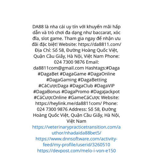 Website: https://heylink.me/da8811com/ DA88 là nha cái uy tín với khuyến mãi hấp dẫn và trò chơi đa dạng như baccarat, xóc đĩa, slot game. Tham gia ngay để nhận ưu đãi đặc biệt! Website: https://da8811.com/ Địa Chỉ: Số 58, Đường Hoàng Quốc Việt, Quận