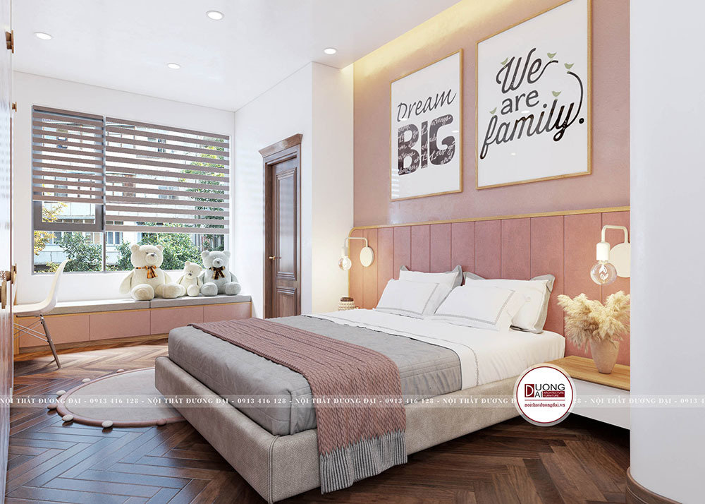 Buồng ngủ được phối 3 màu chủ đạo hồng – trắng – xám nhẹ nhàng