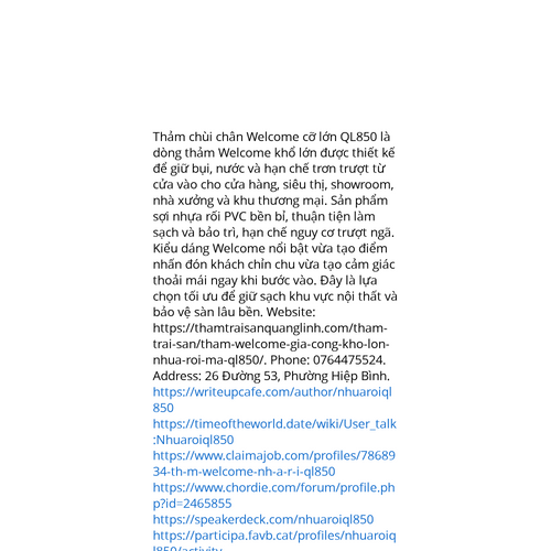 Website: https://thamtraisanquanglinh.com/tham-trai-san/tham-welcome-gia-cong-kho-lon-nhua-roi-ma-ql850/https://thamtraisanquanglinh.com/tham-trai-san/tham-welcome-gia-cong-kho-lon-nhua-roi-ma-ql850/ Thảm chùi chân Welcome cỡ lớn QL850 là giải pháp giữ sàn sạch cho không gian rộng được thiết kế để lọc sạch bụi bẩn, hút ẩm và bảo vệ sàn ngay t