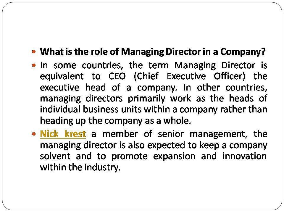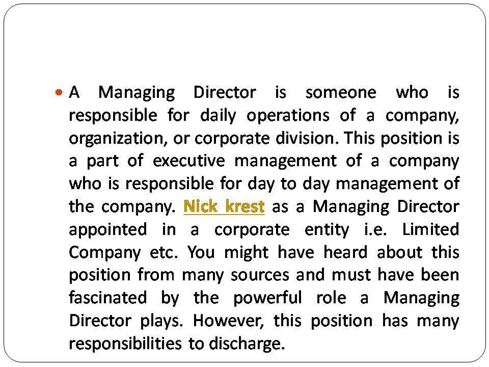 A Managing Director is someone who is responsible for daily operations of a company, organization, or corporate division. This position is a part of executive management of a company who is responsible for day to day management of the company. Nick krest as a Managing Director appointed in a corporate entity i.e. Limited Company etc. You might have heard about this position from many sources and must have been fascinated by the powerful role a Managing Director plays.