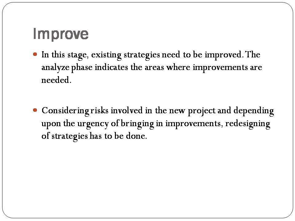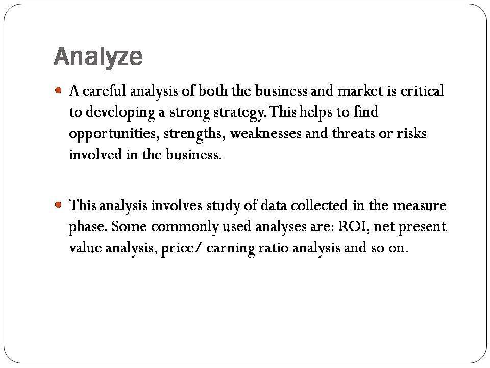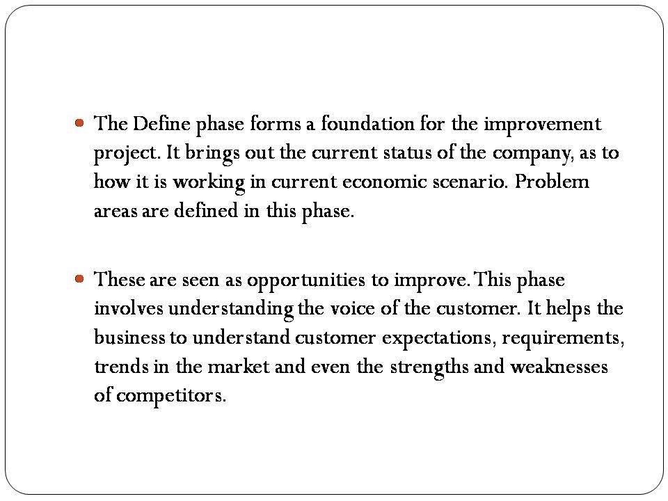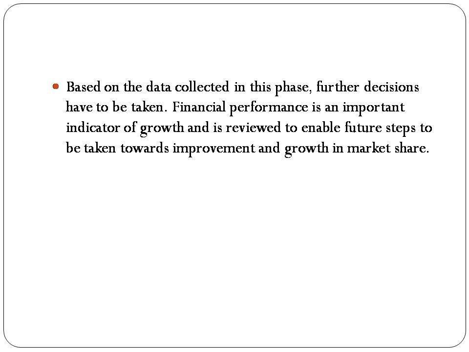 It brings out the current status of the company, as to how it is working in current economic scenario. Problem areas are defined in this phase.
