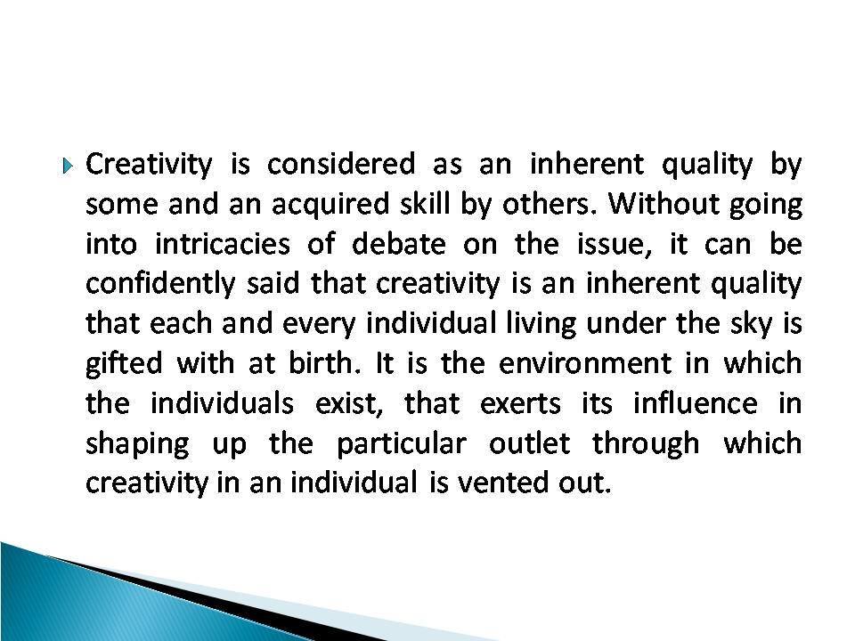 Creativity is considered as an inherent quality by some and an acquired skill by others. Without going into intricacies of debate on the issue, it can be confidently said that creativity is an inherent quality that each and every individual living under the sky is gifted with at birth. It is the environment in which the individuals exist, that exerts its influence in shaping up the particular outlet through which creativity in an individual is vented out.