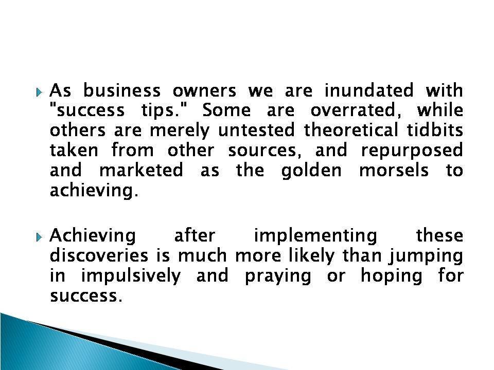 As business owners we are inundated with "success tips." Some are overrated, while others are merely untested theoretical tidbits taken from other sources, and repurposed and marketed as the golden morsels to achieving.