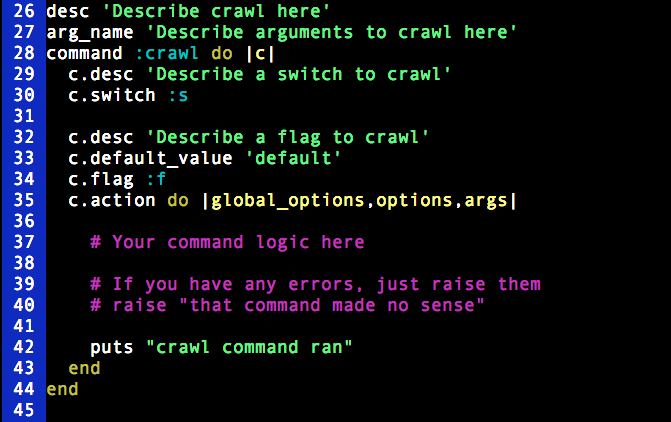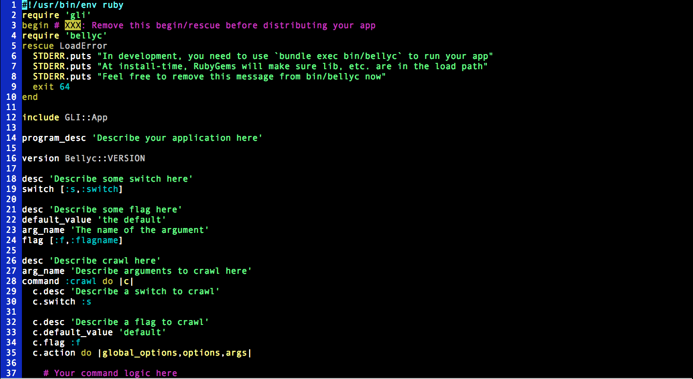 $ gem install gli$ gli init bellyc crawl report exportCreating dir ./bellyc/lib... Creating dir ./bellyc/bin... Creating dir ./bellyc/test... Created ./bellyc/bin/bellyc Created ./bellyc/README.rdoc Created ./bellyc/bellyc.rdoc Created ./bellyc/bellyc.gemspec Created ./bellyc/test/default_test.rb Created ./bellyc/test/test_helper.rb Created ./bellyc/Rakefile Created ./bellyc/Gemfile Created ./bellyc/features Created ./bellyc/lib/bellyc/version.rb Created ./bellyc/lib/bellyc.rb