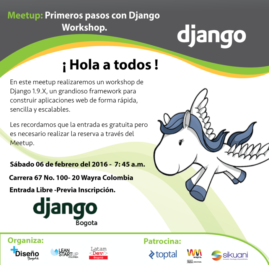 7:45 am - Ingreso. 8:00 am - Fundamentos de Django. 8:15 am - Comienzo del CodeLab. 11:30 am - Preguntas y Respuestas. 12:00 am - Fin.