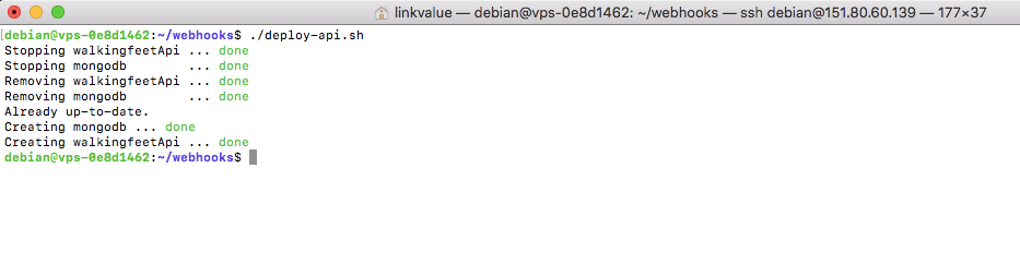 Ici, on constate que la commande docker-compose down stoppe et supprime les conteneurs. Comme il n'y a pas de modifications dans mon code, la commande git pull m'affiche "Already up-to-date" et enfin la commande docker-compose up -d --force-recreate recrée les conteneurs.