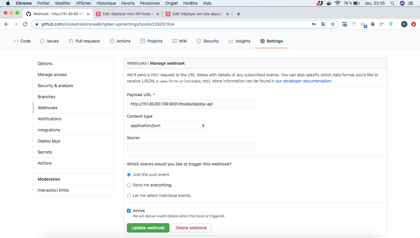 On peut constater que l'appel au hook ne fonctionne pas correctement. La cause est tout simplement parce que nous passons par le nom de domaine en HTTPS.