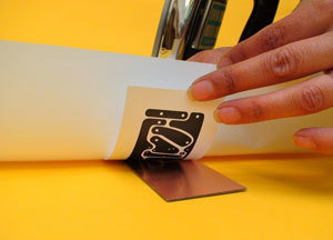 El papel termo transferible es un material utilizado en la elaboración de circuitos impresos de cualquier tipo. Gracias a este papel podemos traspasar a la placa de cobre virgen, el diseño del circuito impreso que hayamos hecho (haya sido hecho a mano o computador), de manera fácil, rápida y económica, para luego introducirla en un recipiente con cloruro ferrico, obteniendo así el circuito impreso deseado. Recomendamos el papel marca (PCBMAKER), aunque también se pueden usar algunos papeles gruesos, usados en dibujo, como el papel Glossy, papel para fotografía o papel Propalcote de unos 120 gramos.