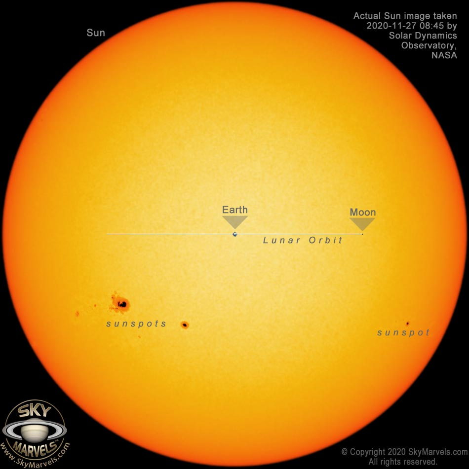 Unlike most illustrations of this kind, in this graphic, the Earth and the Moon are to scale. The Sun is off-screen to the left, about 400 times farther than the Earth-Moon distance and roughly twice as big as the Moon's orbit.