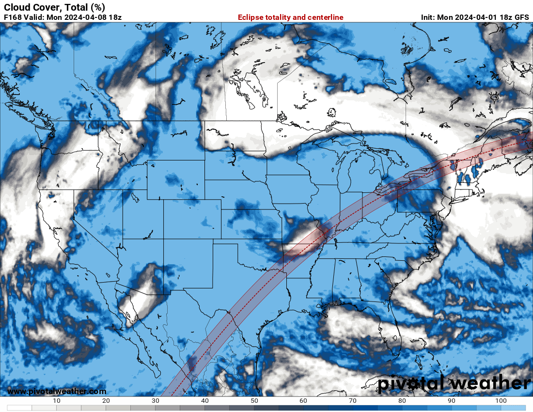 This graph shows the average October cloud cover (2000-2018) from satellite measurements at 10:30 am local time along the centerline of the October 14, 2023, annular eclipse track. Units are fractional sky cover, which can be interpreted as percent cloud cover. Courtesy Jay Anderson, Eclipsophile.com.