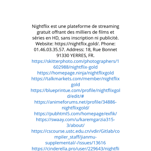 Website: https://nightflix.gold/. Nightflix est une plateforme de streaming gratuit offrant des milliers de films et séries en HD, sans inscription ni publicité. Phone: 01.46.03.35.57. Address: 18, Rue Bonnet 91330 YERRES, FR.