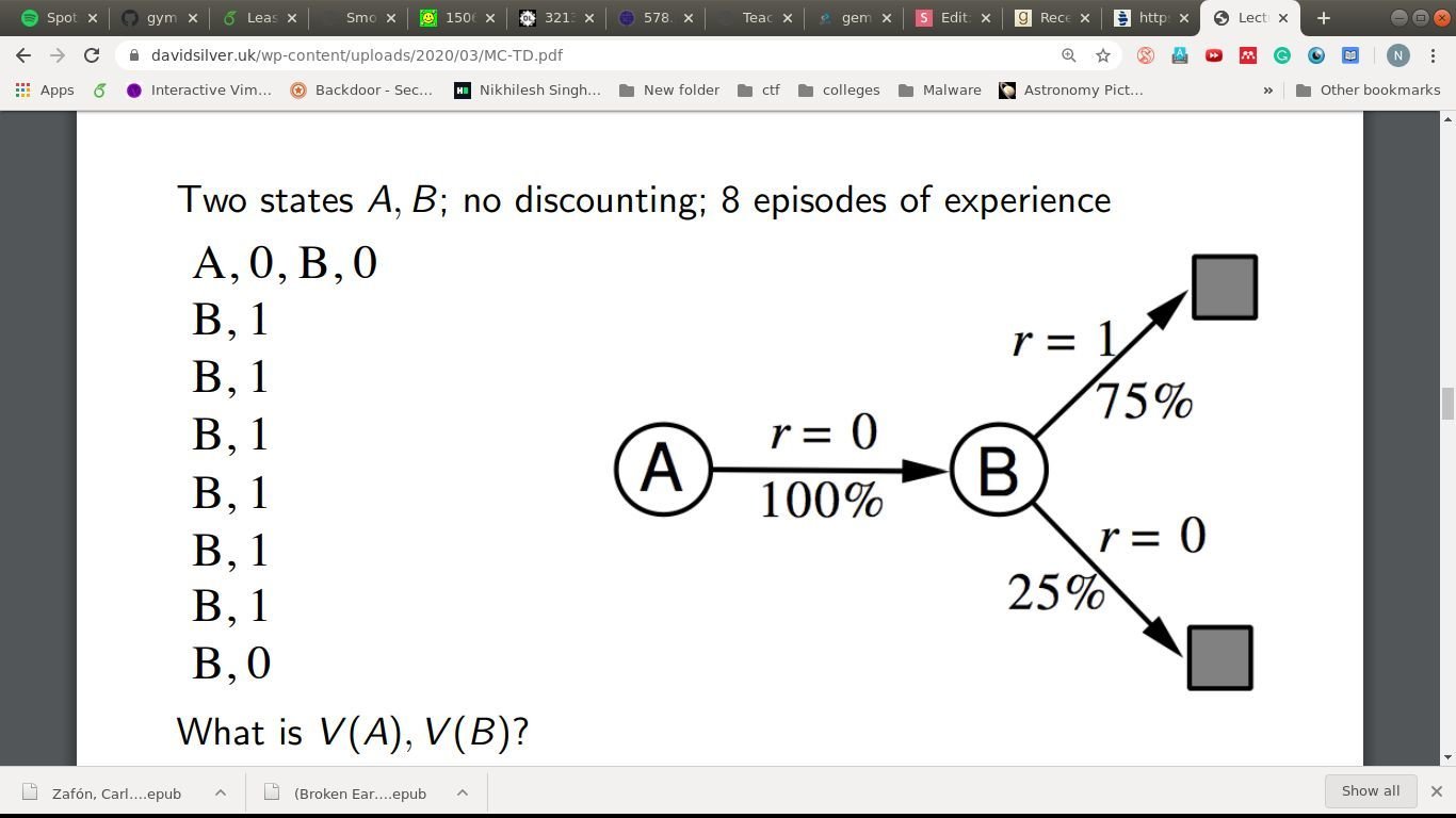 - V(A) = avg return when A was visited = 0/1 = 0