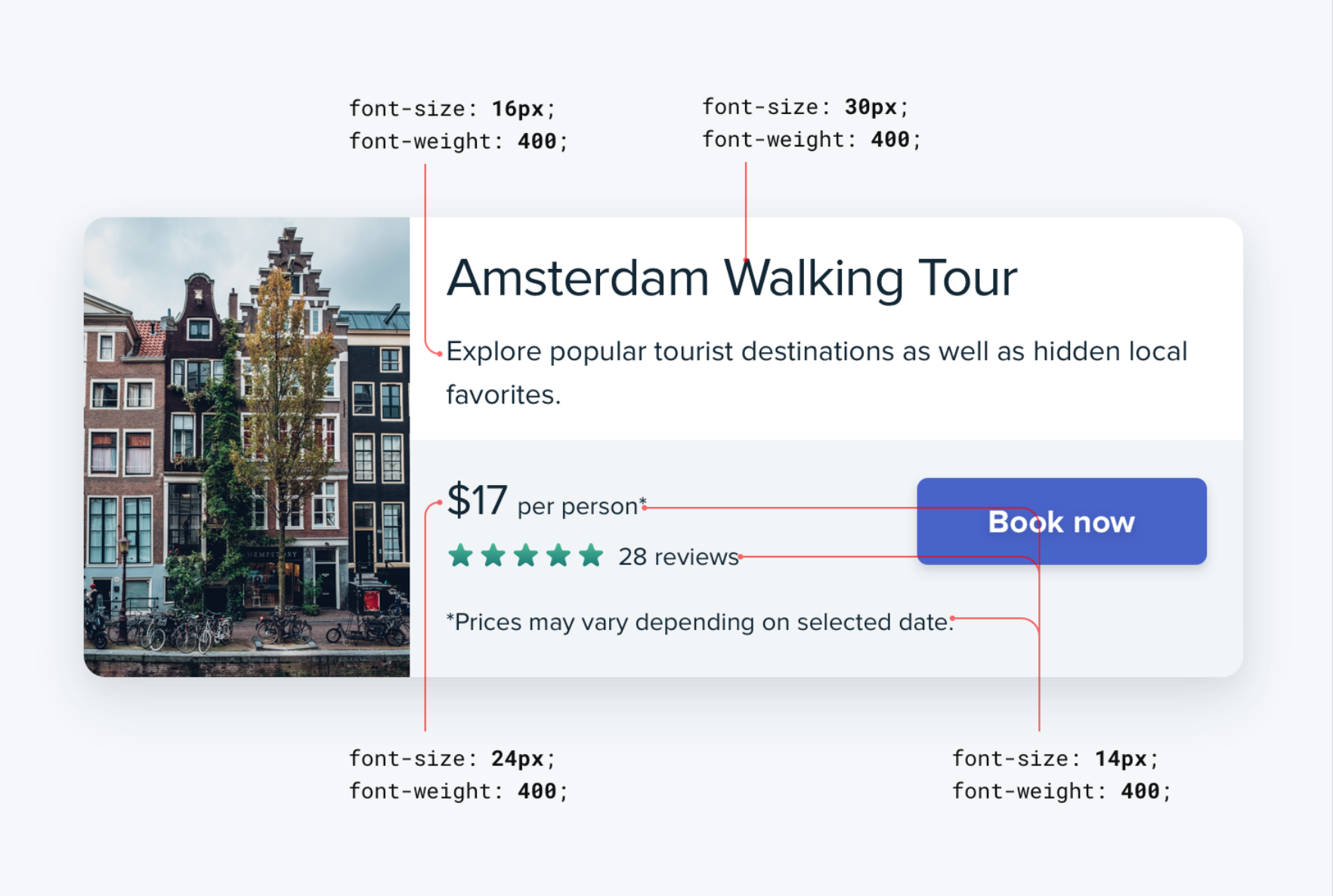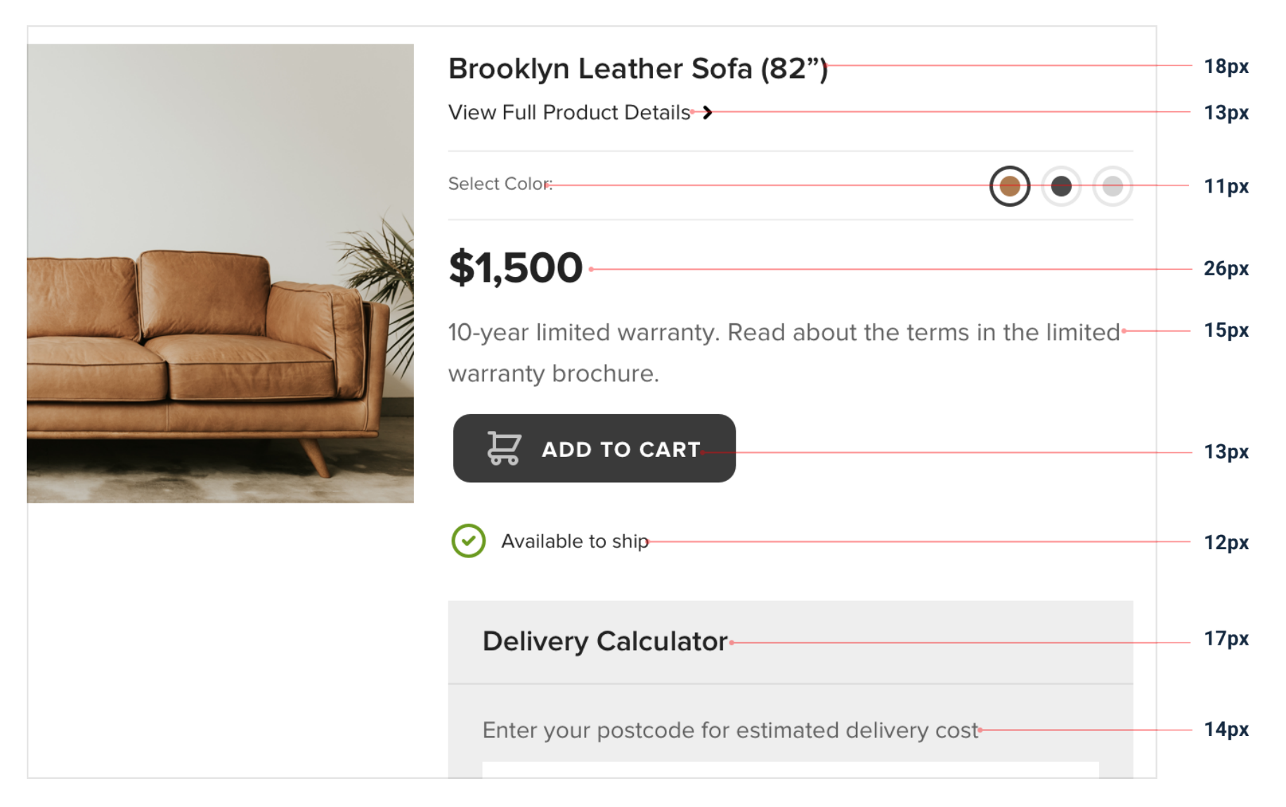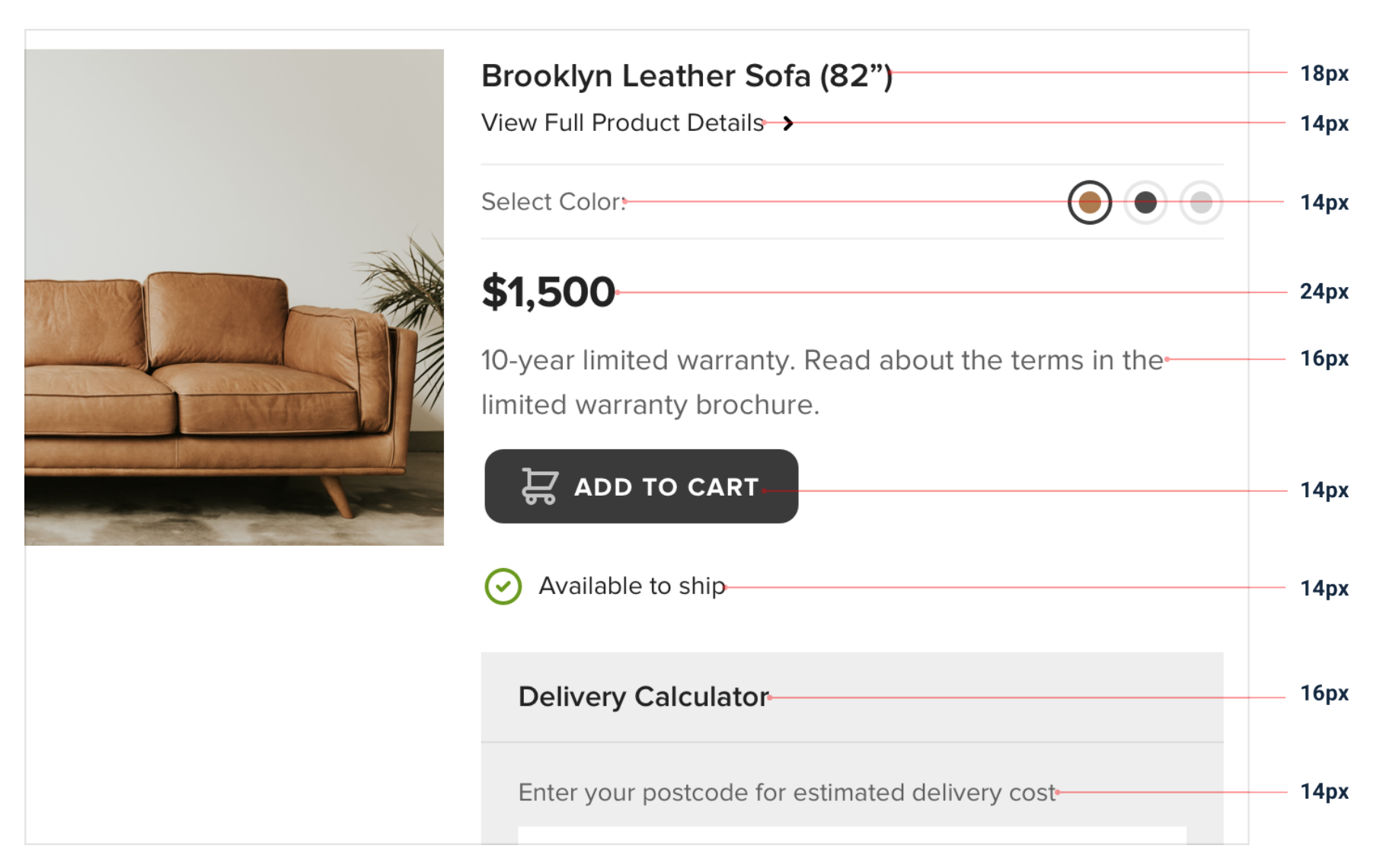 • Font size • Font weight • Line height • Color • Margin • Padding • Width • Height • Box shadows • Border radius • Border width • Opacity