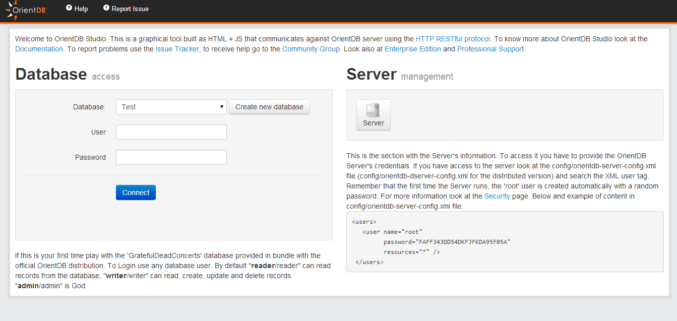 OrientDB memiliki plugin berupa Studio, yaitu web interface untuk mengakses ke dalam server, coba buka http://localhost:2480