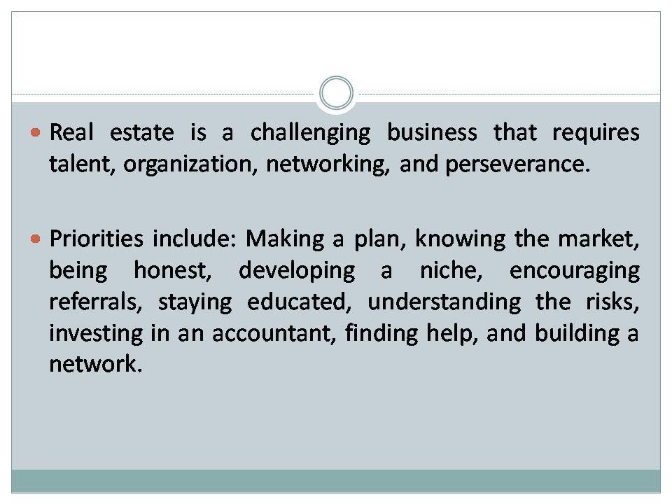 Real estate is a challenging business that requires talent, organization, networking, and perseverance.