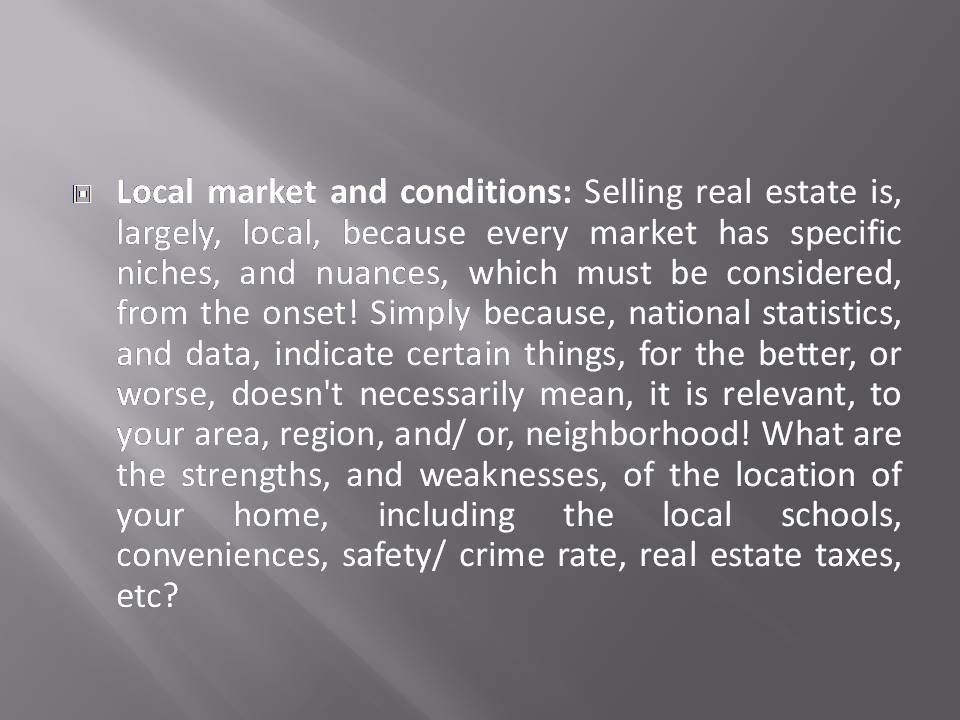 Selling real estate is, largely, local, because every market has specific niches, and nuances, which must be considered, from the onset! Simply because, national statistics, and data, indicate certain things, for the better, or worse, doesn't necessarily mean, it is relevant, to your area, region, and/ or, neighborhood! What are the strengths, and weaknesses, of the location of your home, including the local schools, conveniences, safety/ crime rate, real estate taxes, etc?