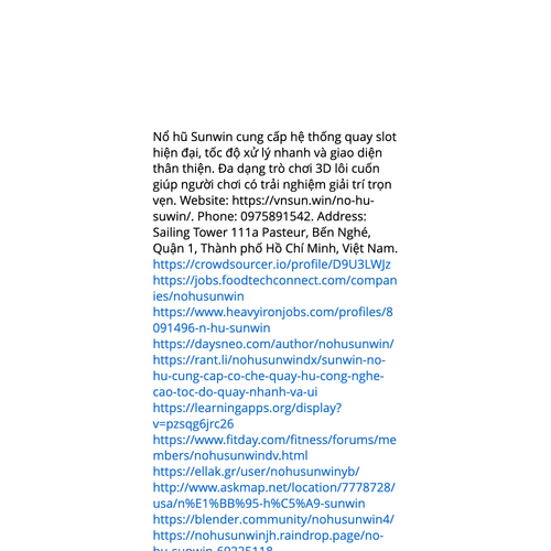 Website: https://vnsun.win/no-hu-suwin/https://vnsun.win/no-hu-suwin/ Game nổ hũ Sunwin cung cấp nền tảng slot tiên tiến, tốc độ xử lý nhanh và thiết kế dễ sử dụng. Đa dạng trò chơi 3D lôi cuốn giúp người chơi có trải nghiệm giải trí trọn vẹn. Phone: 0975891542. Address: Sailin