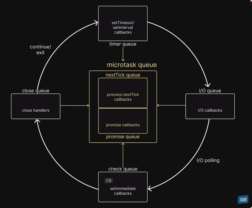 Event Loop: Libuv provides the event loop that Node.js uses to manage asynchronous operations. The event loop is a central part of Node.js's non-blocking I/O model, allowing it to efficiently handle many concurrent connections and tasks.