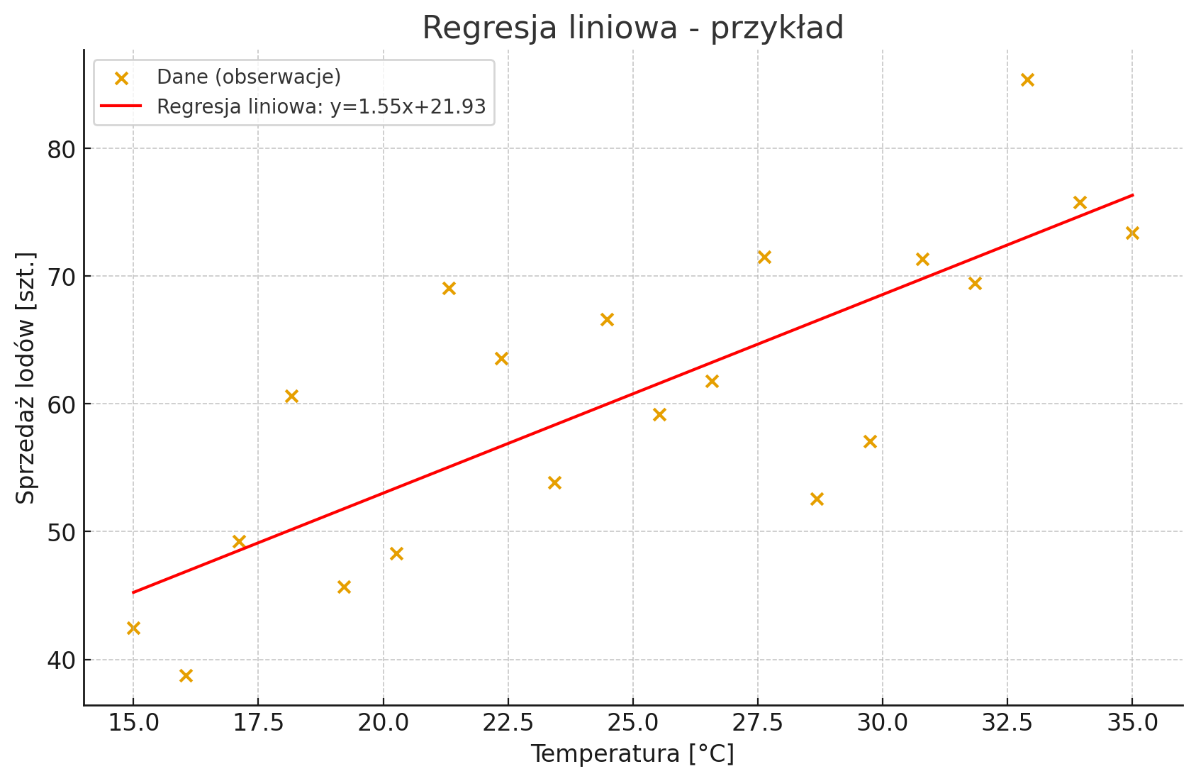 Interpretacja: wraz ze wzrostem temperatury rośnie przewidywana sprzedaż lodów.