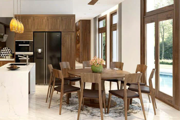 Nội thất gỗ óc chó đang nhận được sự chăm nom rất lớn của giới thượng lưu. Gỗ óc chó khi xuất hiện ở Việt Nam đã phát hành trào lưu mới cho những người có tiền. Thiết kế nội thất từ gỗ óc chó mang vẻ đẹp độc đáo và đẳng cấp nhất. Bàn ăn gỗ óc chó được nhiều gia đình lựa chọn để tôn lên nét đẹp cho phòng ăn. Ngoài những mẫu bàn hình vuông, hình chữ nhật, bàn ăn hình tròn cũng rất được rất nhiều gia đình yêu quý.