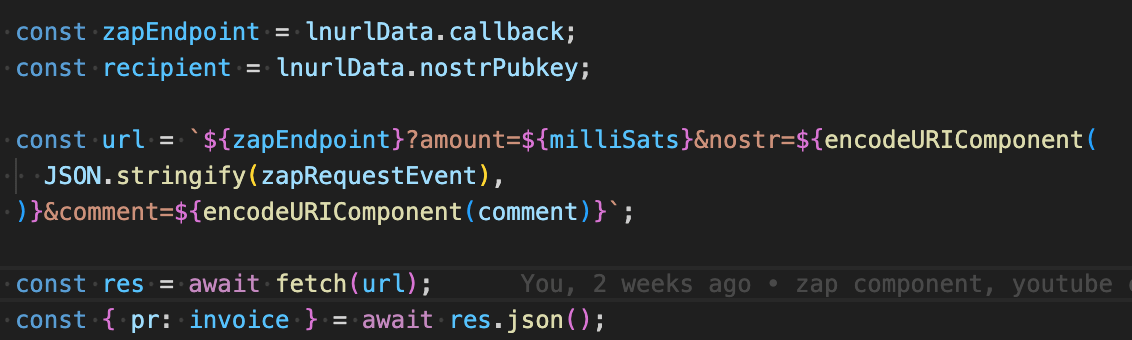 const res = await fetch(lnurl);6. Do a Nostr Zap Request and receive a bolt11 lightning invoice