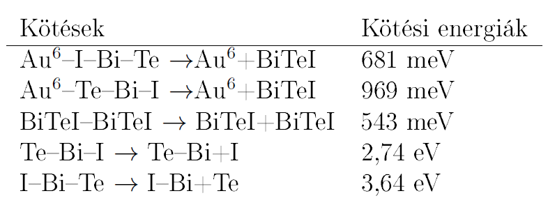 Sűrűségfunkcionál-elméleten alapuló számolások segítségével vizsgáltam a BiTeI arany hordozóra történő exfóliálásának lehetőségét. Származtattam a kötési energiákat az arany hordozó és a BiTeI réteg, illetve a BiTeI rétegen belüli egységek között. A számítások alapján a BiTeI réteg jobban köt az arany felülethez, mint a saját tömbjéhez, de gyengébben, mint a BiTeI rétegben található kovalens kötések. Ebből következik, hogy a BiTeI exfóliálás során nagyobb valószínűséggel marad a hordozón, mint hogy szétszakadna. Meghatároztam a szabadon álló BiTeI és az arany hordozón levő BiTeI állapotsűrűségét, amelyből kiolvasható, hogy az eredetileg szigetelő BiTeI az arany hatására vezető lesz. Ezeket az elméleti számolásokat a Csonka Szabolcs által vezetett, BME-n működő kísérleti csoport kísérletileg is igazolta.