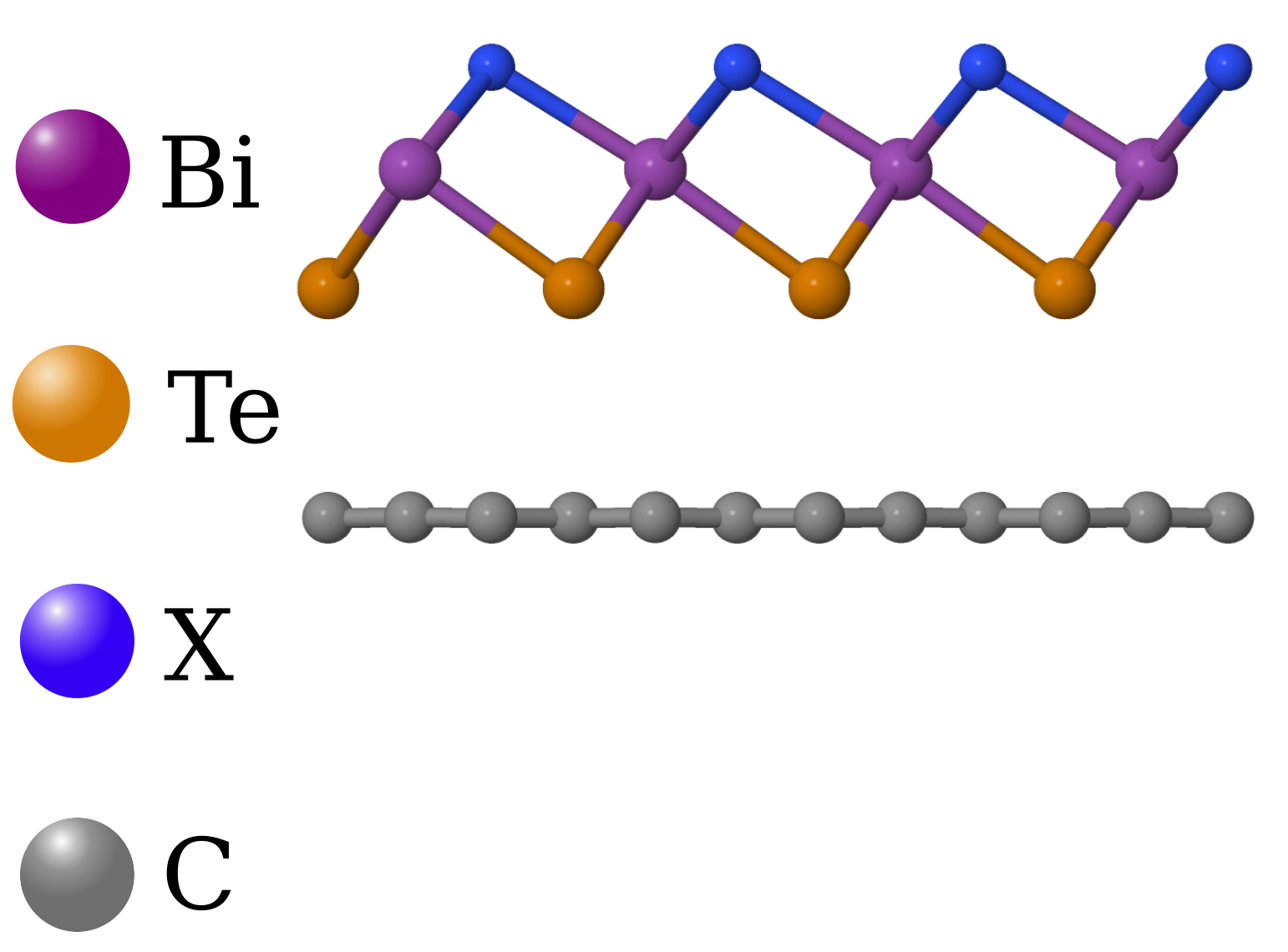 A három különböző családtagból a BiTeCl-t rögtön kizárnám, ugyanis a másféle periodicitása miatt úgy gondolom az exfóliálás és a grafénra helyezés is problémásabb lehet. A kilépési munkák alapján a BiTeI és a BiTeBr közül egyértelműen a BiTeBr kerül ki nyertesnek, a grafén és a BiTeBr kilépési munkája szinte azonos, ezért a BiTeBr / grafén rendszerek esetén a grafén Dirac-kúpjai várhatóan a BiTeBr tiltott sávjának közepébe esnének, így a közös rendszer Fermi-energiája távolabb lenne a zavaró BiTeBr sávoktól.